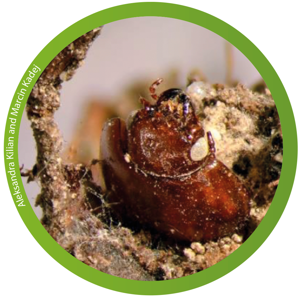 When fully grown, this beetle measures between 3 and 5 mm in length and is brown to cinnamon in colour, which helps it to blend in with the ground and truffles. Its body is compact and oval in shape, allowing it to move around easily between vegetation and the ground. The head is small in proportion to the body and has dark eyes, which are relatively large for its size. The antennae are short, club-shaped, and adapted to detect chemical signals, such as pheromones and possibly volatile compounds in truffles. Similar to the larva, it has strong jaws capable of piercing the surface of truffles and other organic materials in the soil.